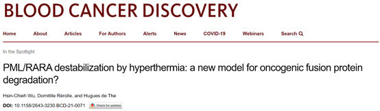 Blood Cancer Discovery期刊将本项工作选为焦点研究(Spotlight),并邀请法国科学院院士,APL领域国际顶尖学者Hugues de Thé教授为该科研成果撰写评论专文:PML/RARA destabilization by hyperthermia: a new model for oncogenic fusion protein degradation? (https://bloodcancerdiscov.aacrjournals.org/content/early/2021/05/07/2643-3230.BCD-21-0071)他对研究团队的工作给予了高度的评价,认为本团队所报道的研究结果以及提出的概念可为进一步研究热疗诱导的融合癌蛋白降解,尤其是是因分子量较大而易于错误折叠及聚集的融合癌蛋白降解铺平了道路。
