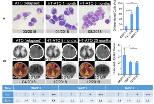 热激与三氧化二砷(ATO)造成的P/R稳定性下降机制不同。因此,团队将两者连用并发现热激和ATO在体内外均具有协同降低P/R蛋白稳定性的作用。在此基础上,那仁满都拉教授团队尝试性地对3例复发难治性APL耐药患者(包括1PMLP/R双突变耐药患者、2例中枢神经系统复发患者)采用热疗与砷剂的联合疗法进行治疗,均在一定程度上缓解了病情并促进了相关治疗指标的改善。这些患者的临床数据强烈证明热疗与砷剂联合对传统疗法无效的APL砷剂耐药患者具有一定的治疗潜力。