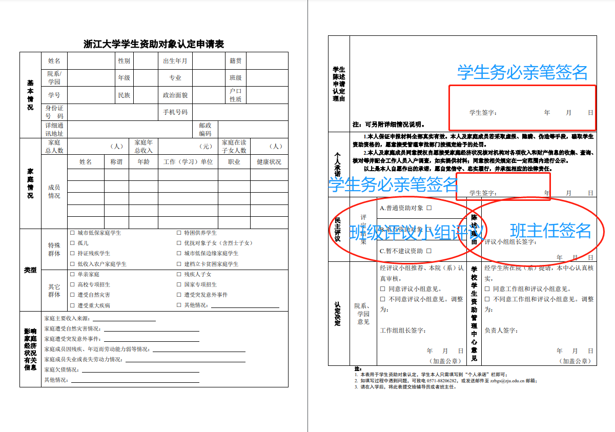 92424:00,请班主任老师组织班级资助对象认定评议小组完成班级学生资助对象困难档次的认定;各班评议小组汇总信息并填写《浙江大学学生资助对象汇总表》(附件三电子版)、相关学生的《认定表》(一式两份、评议小组组长签字)上交至各年级辅导员处。
